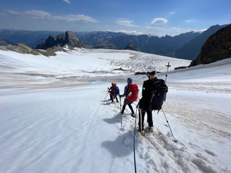 Die saftigen, grünen Wiesen lassen wir bald unter uns und wandern stetig höher bis zum legendären Iswändli. Ganz früher eine richtige Eiswand, ist diese heute nur noch ein geneigter Hang und mit Steigeisen leicht zu begehen. Bald erblicken wir den Gipfel des Clariden. Doch vorher überschreiten wir noch den Vorgipfel und kraxeln über den kurzen Felsgrat, der mit Ketten ausgerüstet ist, zum höchsten Punkt. Bei guter Fernsicht können Sie einige Viertausender der Berner und Walliser Alpen sehen. Nach einer zünftigen Gipfelrast, steigen wir auf Firn und Schnee zum Claridengletscher ab. Auf diesem und über den vergletscherten Claridenpass erreichen wir bald die, von mächtigen Gletschern umgebene, Planurahütte. Eine wahrlich schmucke Oase in dieser Hochgebirgswelt.
